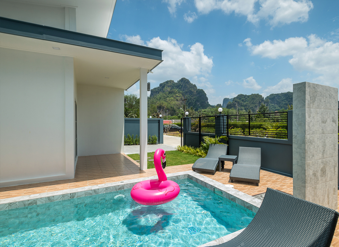 A privacy and peace in our magnificent 200 and 400 square meters, features with the full facilities for an affordable relaxing getaway in Krabi. The interior tastefully comprises 1 & 3 bedrooms which is suitable for 2 and 6 but can also accommodate up to 9 peoples with additional charge, private en-suite bathrooms, a living and dining area with Europe style kitchen in the same open space, and special relaxing roof top terrace for 3-bedroom pool villa. The villa is a perfect choice for family, friends or couples traveling together.